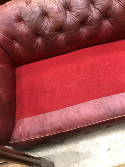 A late 19th or early 20th Century , red LEATHER button back two seater settee having later dralon cushions, leather work a bit faded and stitching loose else in sound condition, see additonal images, still quite springy
