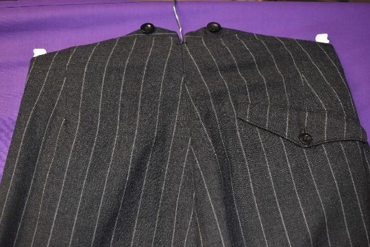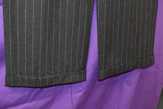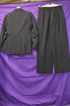 A vintage 1940s gents double breasted grey pinstripe suit, comprising of jacket and fish tail backed high waisted trousers with wide bottoms and turn up,buttons for braces and button fly, Beautifully tailored, small to medium size.