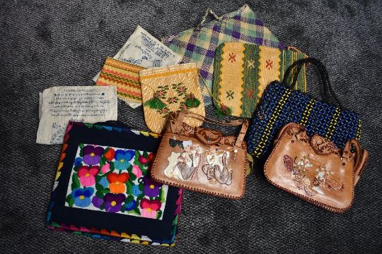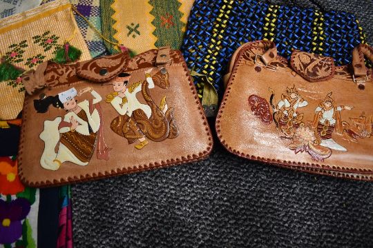 A collection of vintage bags from Burma, including two with hand painted scenes to fronts,and another made by children in Rangoon.