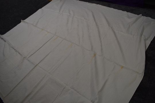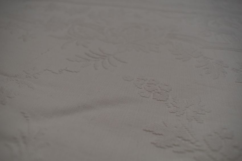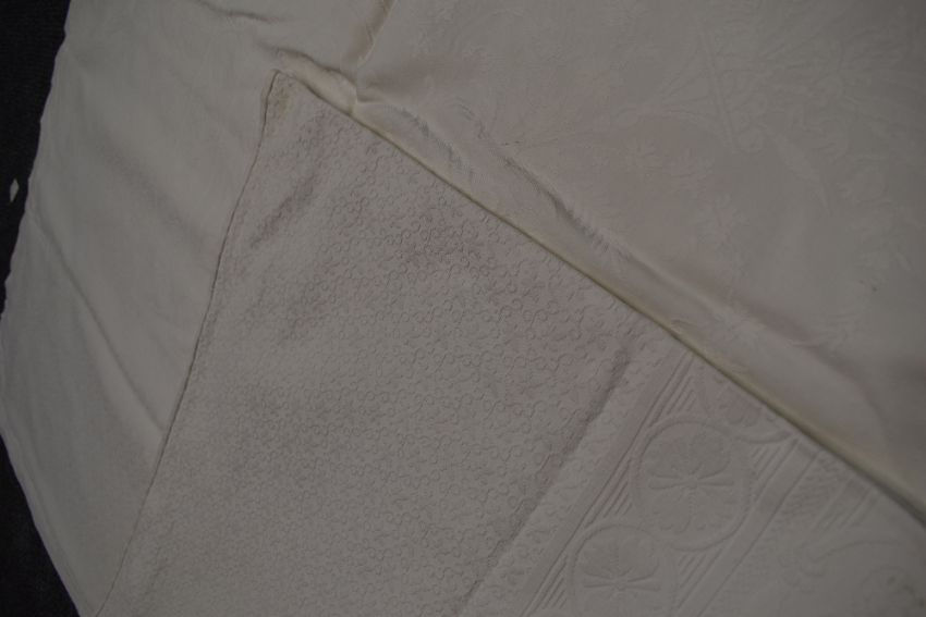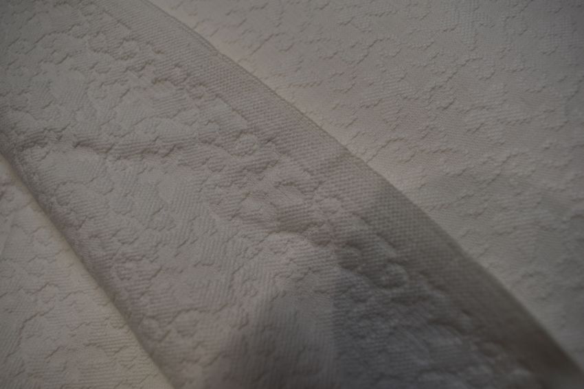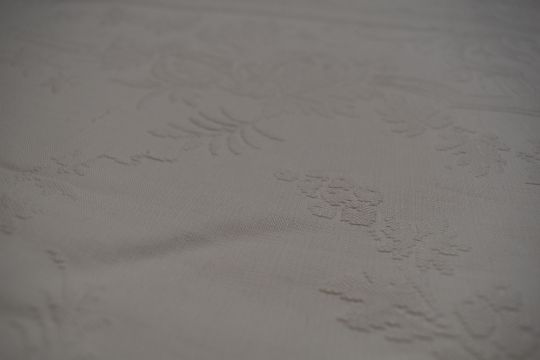 An antique white marsella bed throw having floral pattern with urn motifs and more.