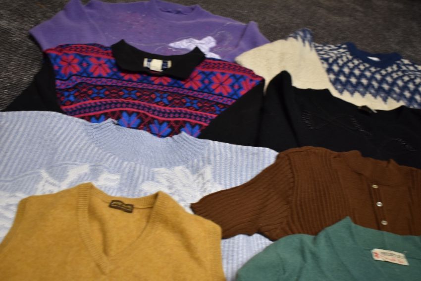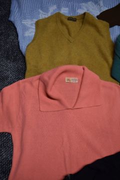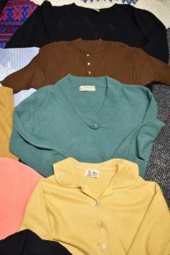 A collection of vintage and retro knit wear, including 1950s/60s ochre cashmere cardigan by Pringle, 1940s/50s black knitted all in one, and green Harvey Nichols 'the pringle bar' jumper.