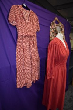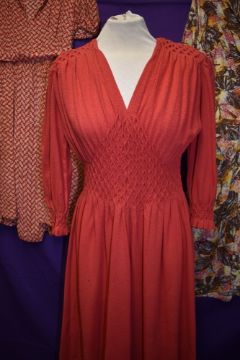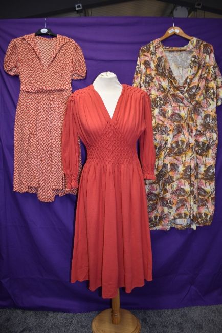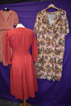Three 1940s and 50s dresses including cherry red wool dress with honeycomb smocking.
