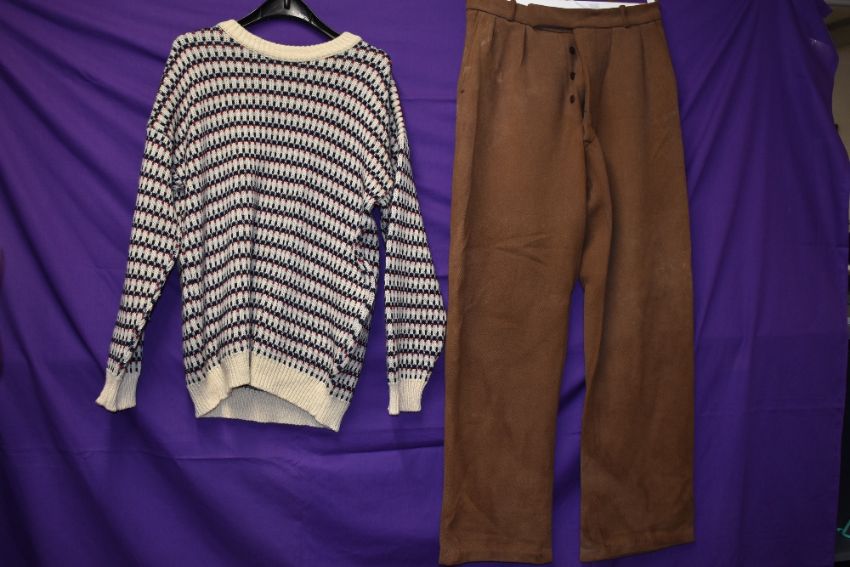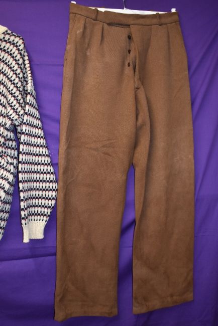A pair of vintage 1950s gents button fly wool trousers in brown and a retro Laxey woolen mill jumper.