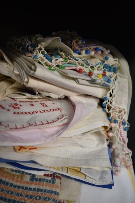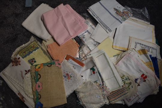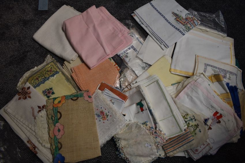 A large lot of vintage table linen,some having embroidery,also included are beaded milk jug covers.