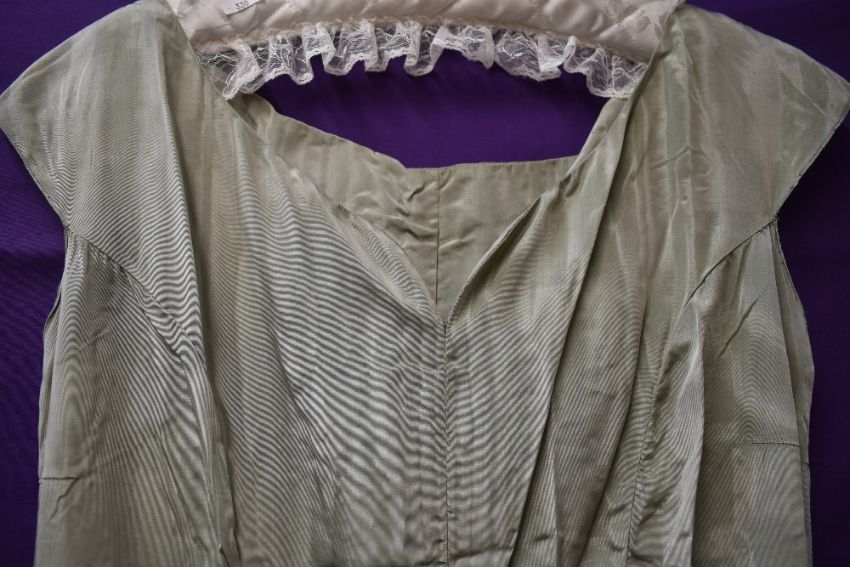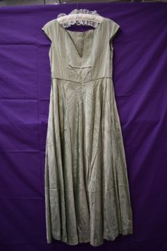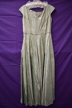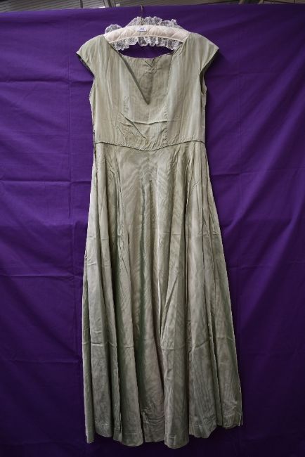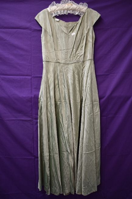 A 1940s pale green full length watered taffeta dress, having side hook and eye fastening.