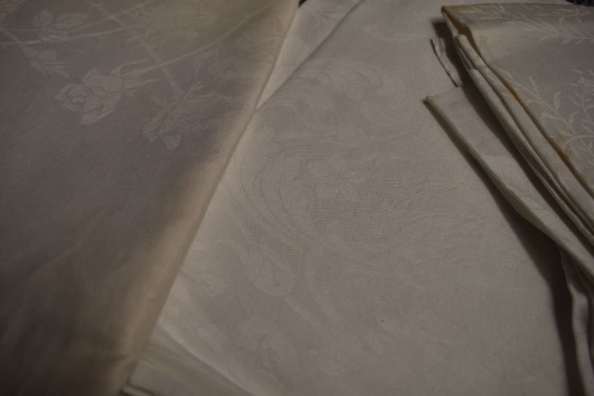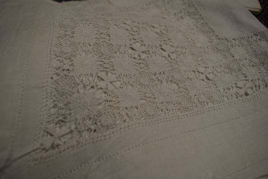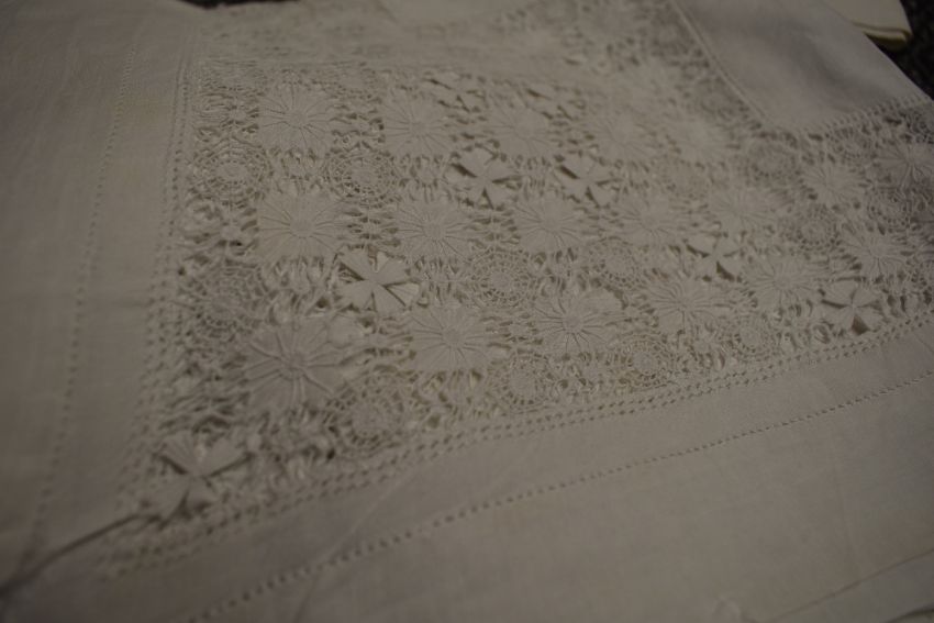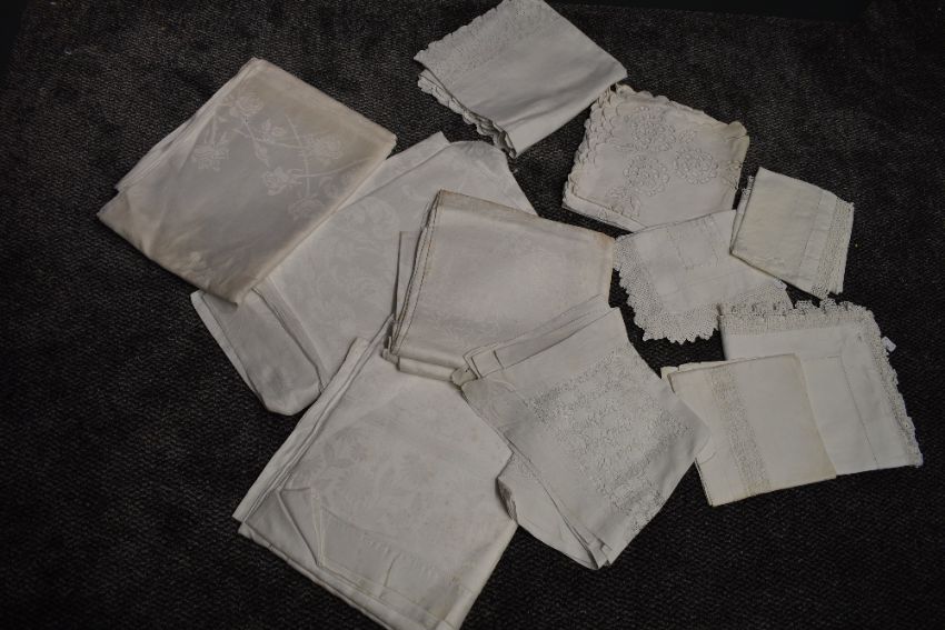 A selection of antique white work table linen including tray cloths,table cloths and more.