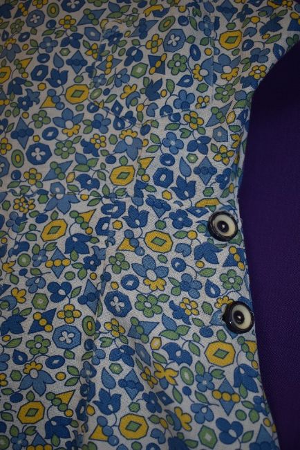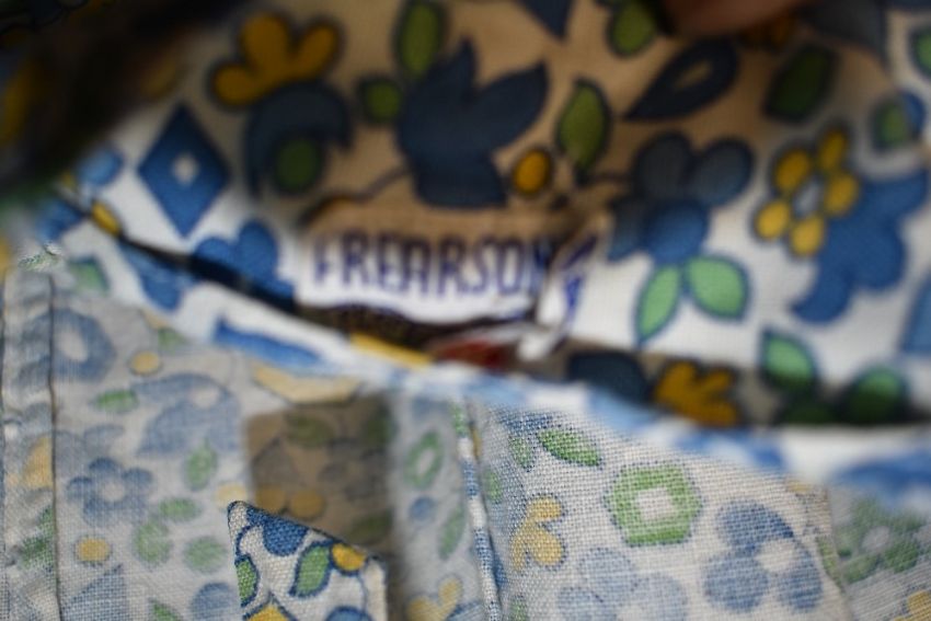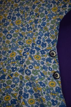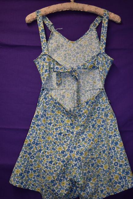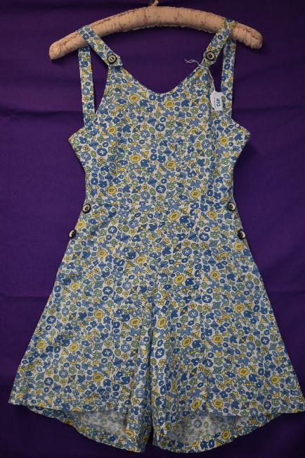 A 1940s cotton playsuit having bright floral print, buttons to both sides and buttons to front of straps with ties to back, Frearsonia label.