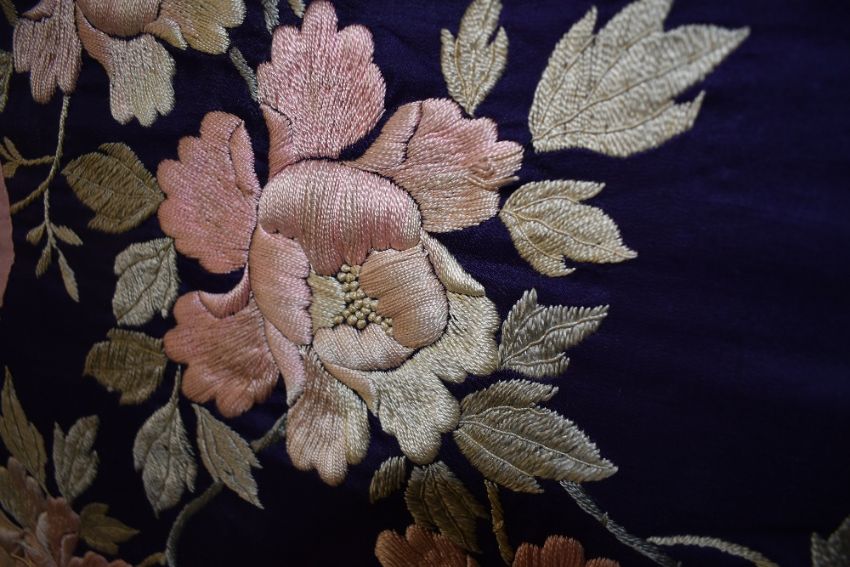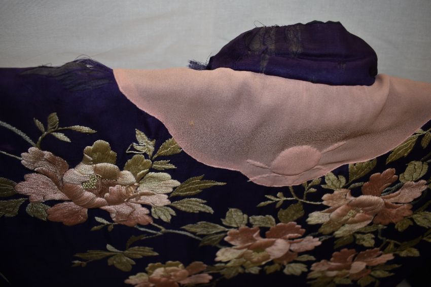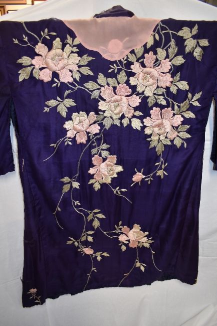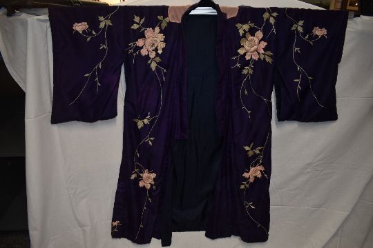A purple silk kimono dressing gown having extensive floral embroidery,around 1920s-40s,a couple of areas of age related wear.
