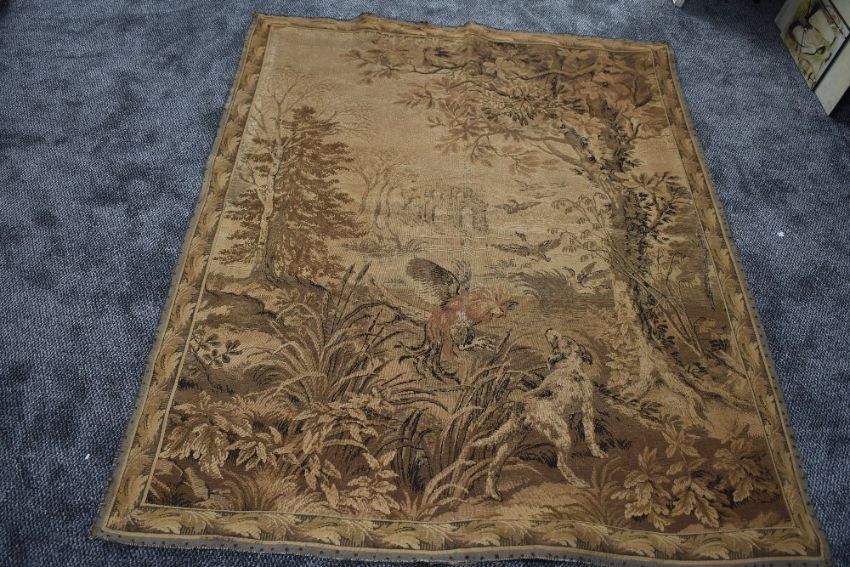 An antique woven tapestry or similar having hunting theme of dogs and birds.