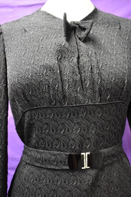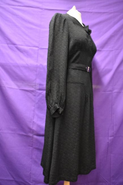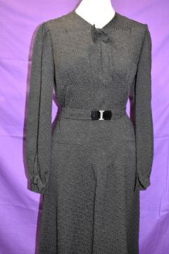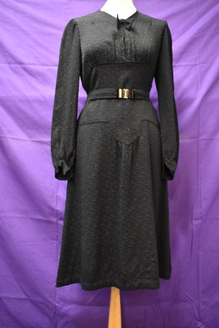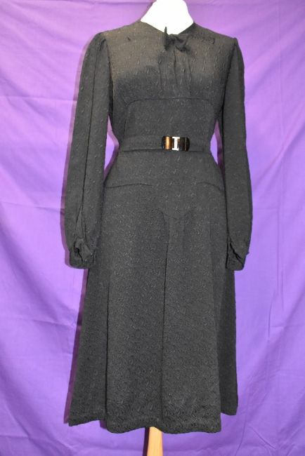 A 1930s/early 40s black textured crepe dress with belt to waist,bow to neckline and balloon sleeves around a medium size.