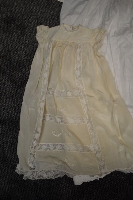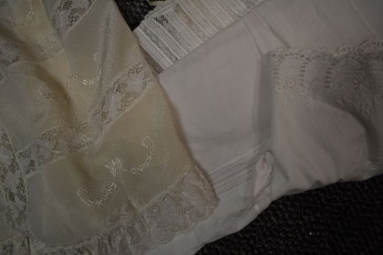 Three antique items of baby clothing including one long gown with cut work and embroidered hem, tie sash to waist and lace to collar, cuffs and body, another similarly styled in a fine cotton and another in crepe like fabric with lace to hem, and bands to the front of bodice down to hem 'Bairnswear' label.