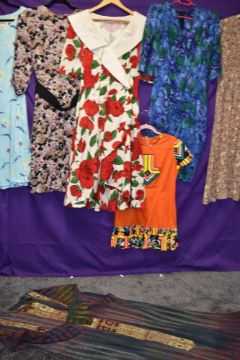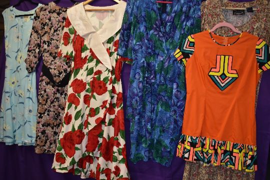 Six brightly patterned vintage 1980s dresses, mixed styles and sizes.