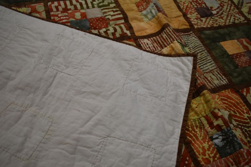 A large retro quilt made up of sections of autumnal shades of tie dyed cotton.