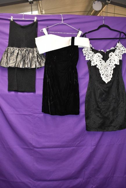Three 1980s evening dresses,including off shoulder dress in black velvet,smaller sizes.