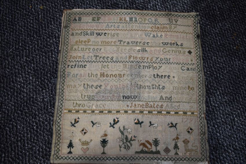 An antique embroidery sampler by Jane Bates,dating to 1791,loosely mounted on board, some wear in places.