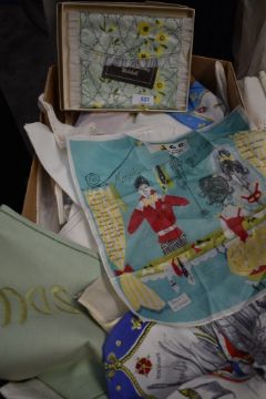 A box of vintage handkerchiefs including advertising souvenir/commemorative, hosiery case in box and more.