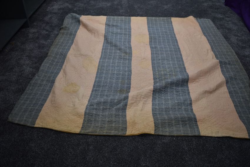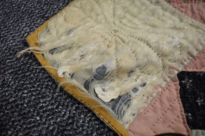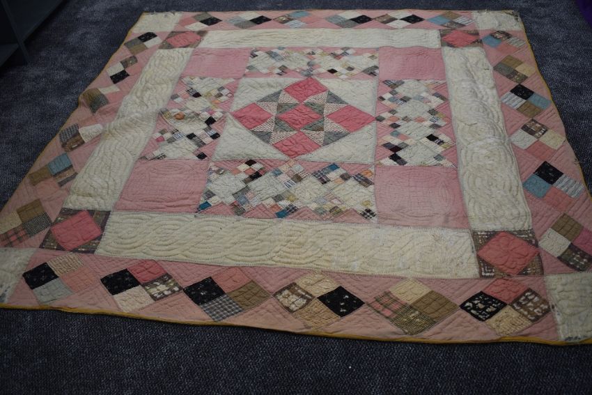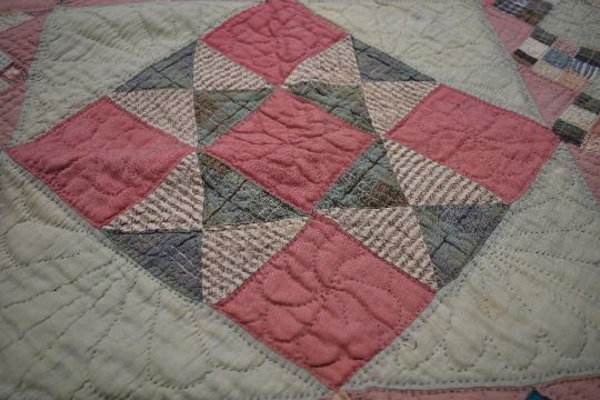 A large Victorian patchwork quilt, using various wool and wool blend fabrics, around a double in size,some age related wear.