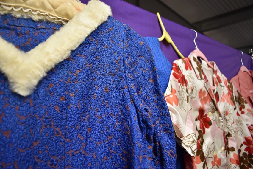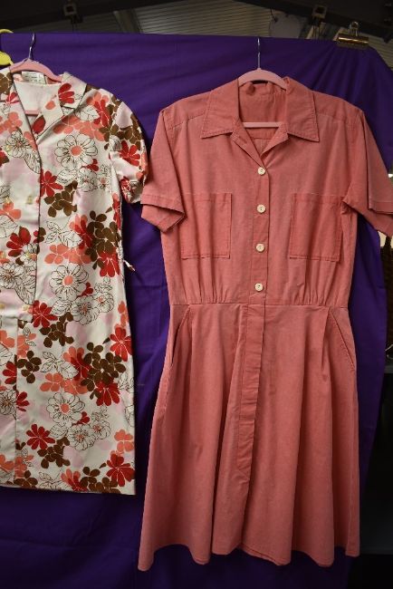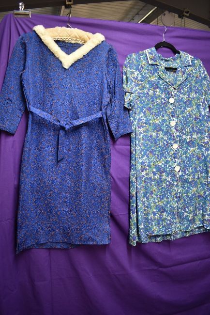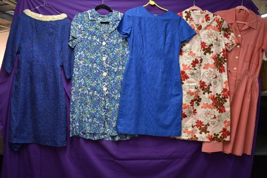 Five vintage 1950s and 60s dresses, various fabrics, styles and sizes.