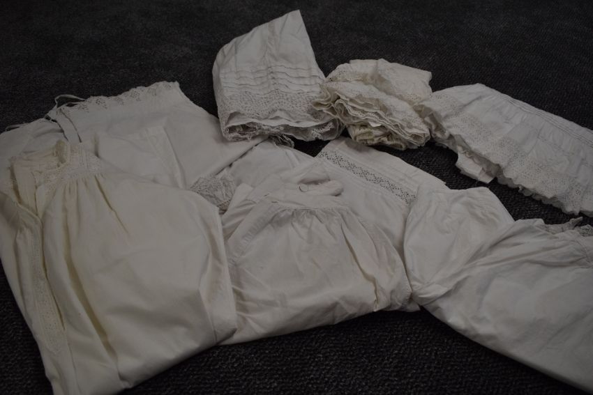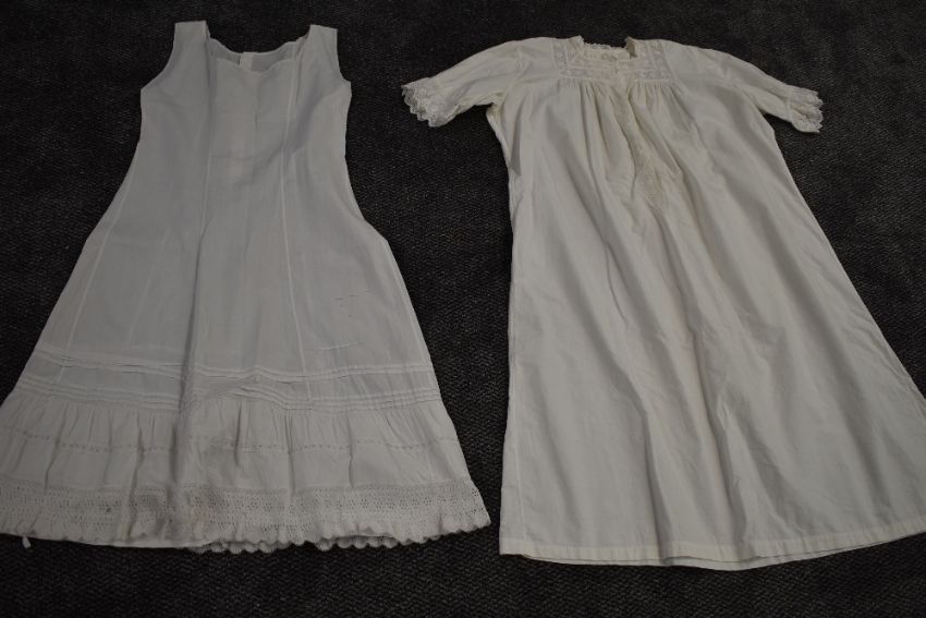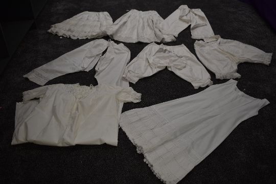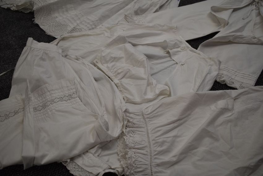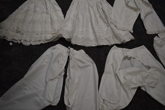 A collection of victorian white cotton items including two pairs of Victorian bloomers, crisp cotton with both having intricate details to the legs, both have button 'flap' to the seat of each,three petticoats,nightdress and two pairs of split leg bloomers.