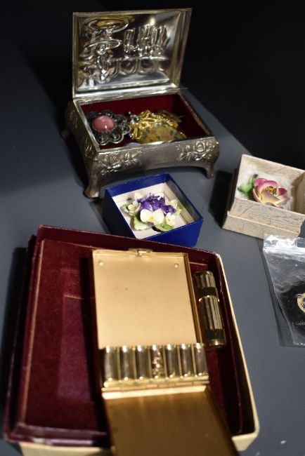 A vintage compact in box having integrated cigarette case to one side,powder to the other and lipstick holder to side, also included in a trinket box with an assortment of costume jewellery.