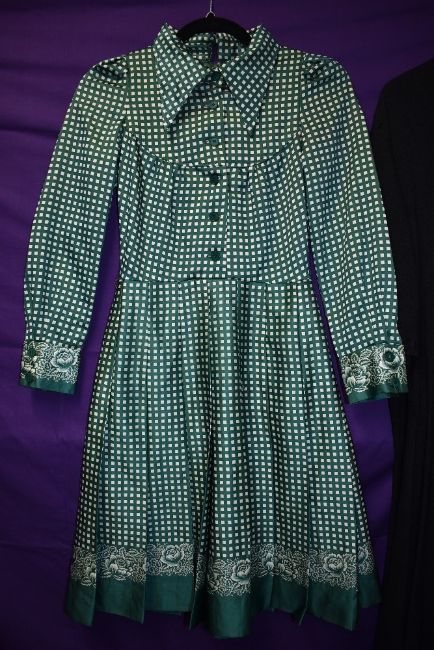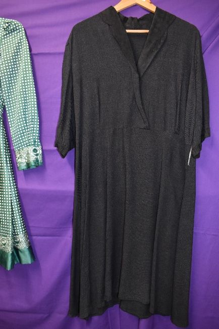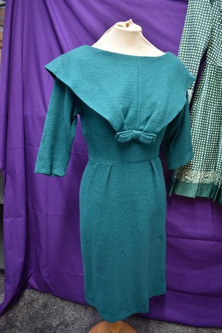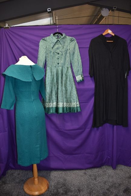 Three vintage dresses, including tailored green wool dress with large sailor collar,black 1950s wool blend dress in a large size, and green rose patterned Sutera dress.