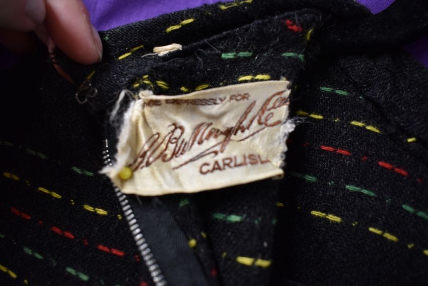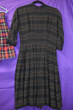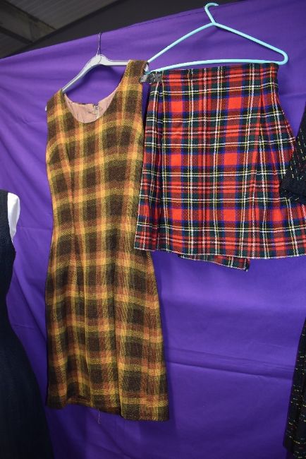 A collection of vintage clothing including 1950s wool dress, two late 50s/60s pinafores and a tartan mini skirt.