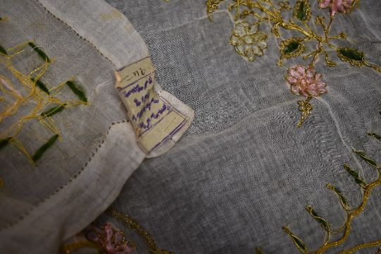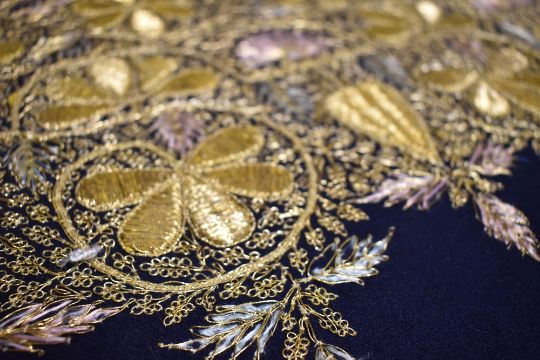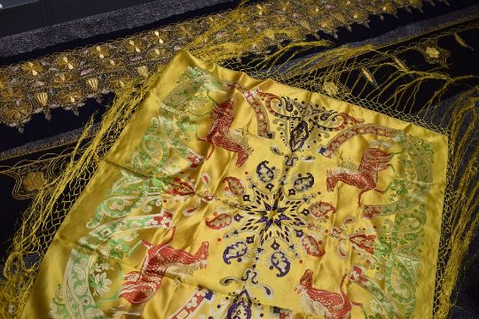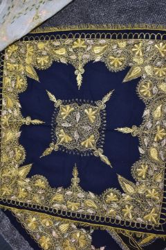 A collection of wool panels having heavy and extensive metal embroidery and silk thread design on navy blue wool, dating to 1916, from Burma.also included is a similar cloth and a heavily fringed shawl.