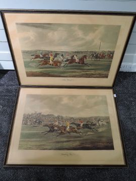 A pair of prints, after Alken, The Start and Coming In, horse racing interest, 20th century reproductions, each 50 x 70cm, framed