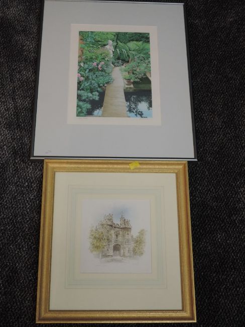 A watercolour, Martin Woodruffe, Lancaster Castle, 21 x 18cm, framed and glazed, and a ltd ed print, garden study, 33 x 28cm, framed and glazed