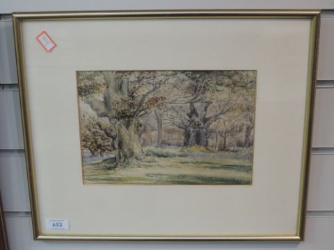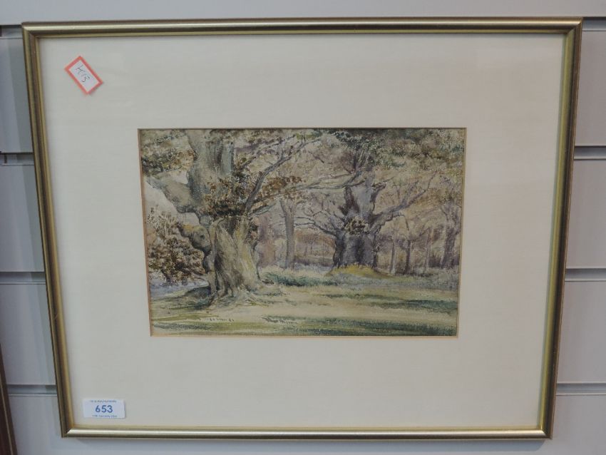 A watercolour, Ancient Oaks, woodland landscape, 17 x 25cm, framed and glazed