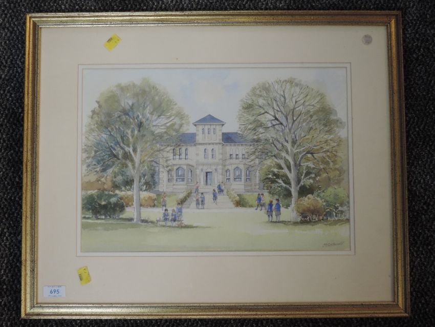 A watercolour, McDonald, school and grounds, signed, 30 x 47cm, framed and glazed
