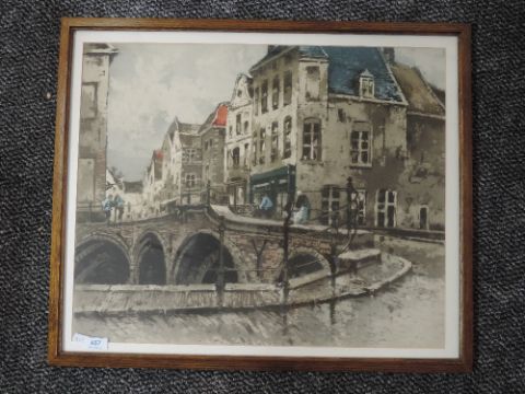A print, A street in Flanders, 45 x 55cm, framed and glazed