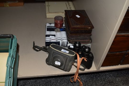 A selection of items including Milo binoculars, vintage Kodak camera, stud box, handkerchiefs, and a boxed cork screw.