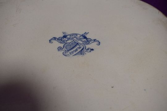 A large Blue and white platter having transfer pattern of classical scene to centre, marked A shaw too reverse.