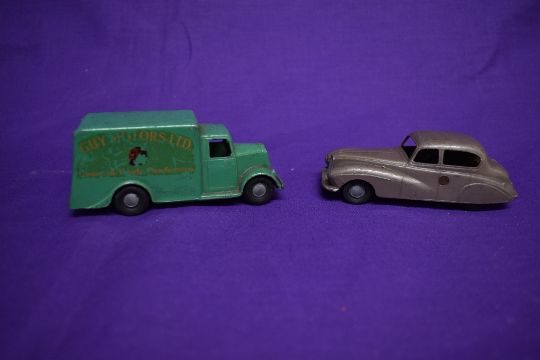 Two Chad Valley clockwork Weekin diecasts, Guy Van in green with Guy Motors Ltd decal and Sunbeam Talbot in grey