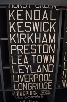 A local interest train tram or bus transportation destination blind for Lancashire and Cumbria including Preston Keswick and Kendal