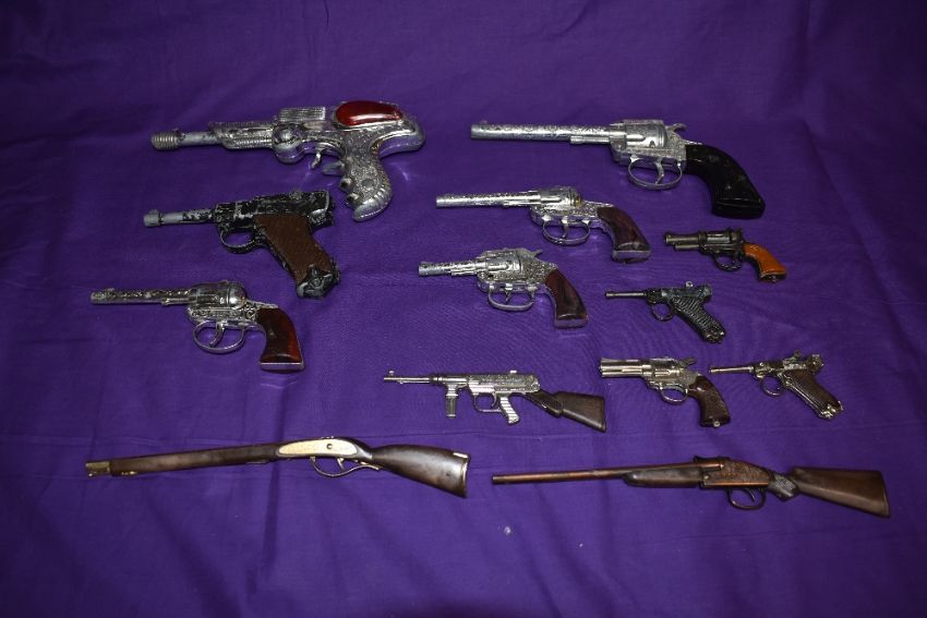 A selection of 1960's and later Toy Cap Guns BCM style Space Outlaw, Crescent Bronco, Lone Star Cody 45, Crescent Luger, Redondo Al Capone, Automatic, Cobrai, Kentucky and Sport and two similar guns