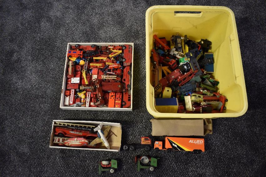 A shelf of mixed vintage playworn and boxed diecast vehicles including Matchbox, Lesney, Ralstoy etc