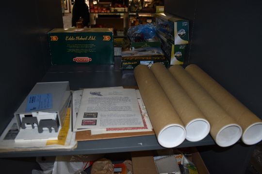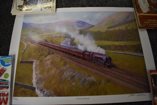 A shelf of Railway related colour slides, posters including John Austin Limited Edition Prints, used stamps, etc