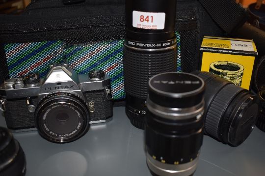 A Pentax MX with 40mm, Pentax M lens, Pentax m 80-200mm lens, a Sigma UC Zoom 28-105mm, Pentax M 28mm, a Takumar 135, a Tokina 400mm lens, a Ohnar zoom Reverser Tele Converter Aico extention tube and a selection of filters in a soft camera bag and a Pentax ESPIO 140 camera