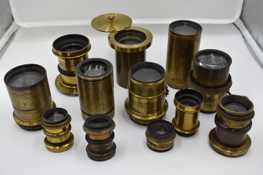 A selection of twelve brass lenses including 8 inch, Optimus etc