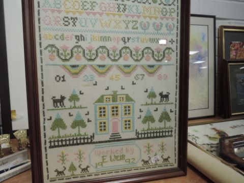 An embroidery sampler by E Wier dated 1992 depicting house,alphabet and trees.