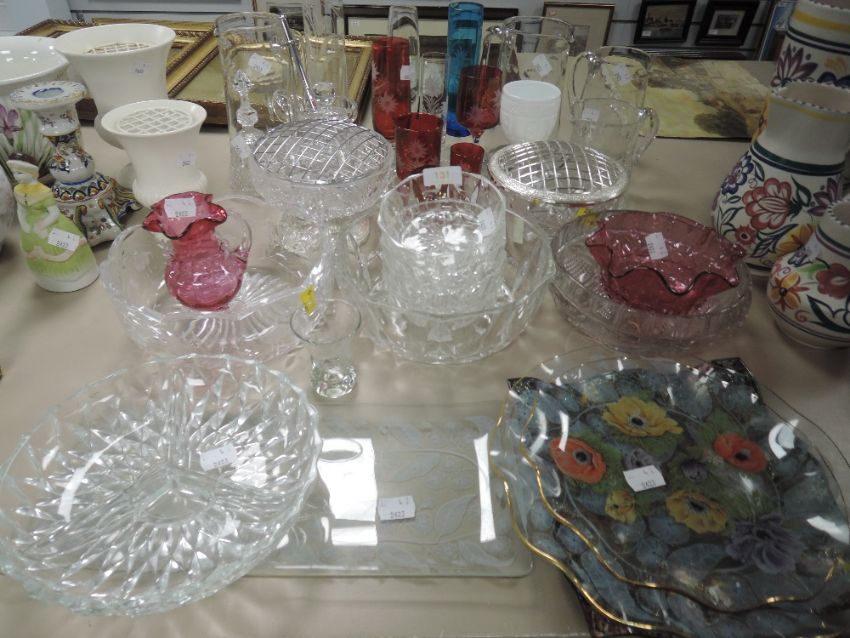 A varied lot of vintage glass including coloured, etched and cut examples, rose bowls,fruit bowls, jugs and more.