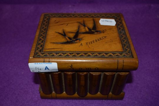 A Sorrento jewellery case or similar box in the form of books decorated with Swallows 'A Rivederci' also having secret compartment
