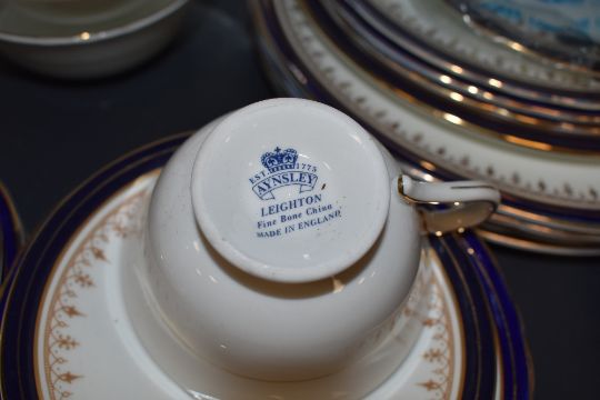 A part Aynsley Leighton dinner service having white ground with royal blue edge and gilt motif included are soup bowls,cups and saucers plates and platters, around forty one items.