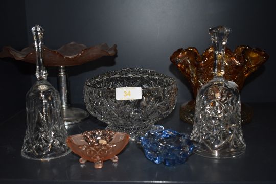 A selection of pressed and colour glass wares including pink footed tazza