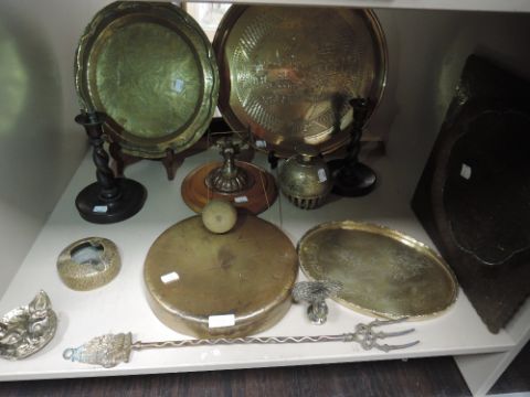 A mixed collection of brass ware amongst which are a dinner gong, Indian bell,pin dish in the form of a cats face, platters and more,also included are two wooden barley twist candlesticks.