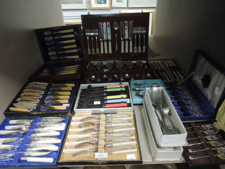 A large lot of mixed vintage and antique boxed cutlery sets and canteen including cake forks, fish serves, spoons, knives and forks and more,some really good quality items in this collections.