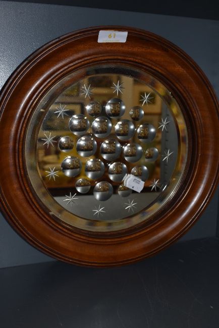 An oak framed circular Edwardian mirror having multiple bulls eye and star designs