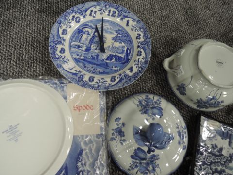 A selection of blue and white wear ceramics including graduated Spode jugs having black back stamp